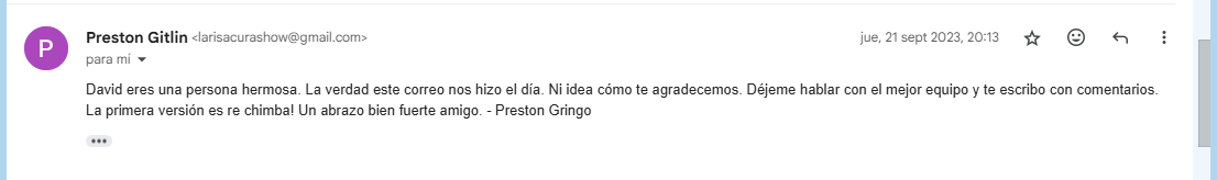 Fue una conversación muy agradable la que tuvo lugar unos días después, para hacerles entrega del sitio web y coordinarnos. En ella, Preston hizo las bromas que lo caracterizan, y me reí como loco de ellas. Pero a la vez, estaba muy agradecido por mi regalo y me lo hizo saber de muchas maneras… Especialmente cuando no quiso recibirlo de gratis. Quise decirle que no, que era un regalo y quería que se mantuviera así, pero me lo dejó claro: «No es justo que algo tan grande sea gratis. Cóbranos, no tengas problema».